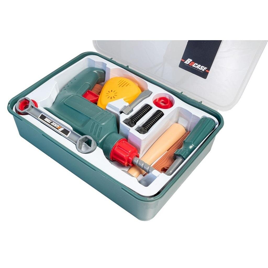 Narzędzia w plastikowym pudełkuNarzędzia w dużym pudełku to doskonała zabawka dla małego majsterkowicza. Wszystkie narzędzia po zabawie można schować do środka.Kiedy naciskamy przycisk wiertarki, wiertło obraca się.Śrubokręt na 2 końcówki do wymiany (z końcówką płaską i krzyżykiem)Skład...
