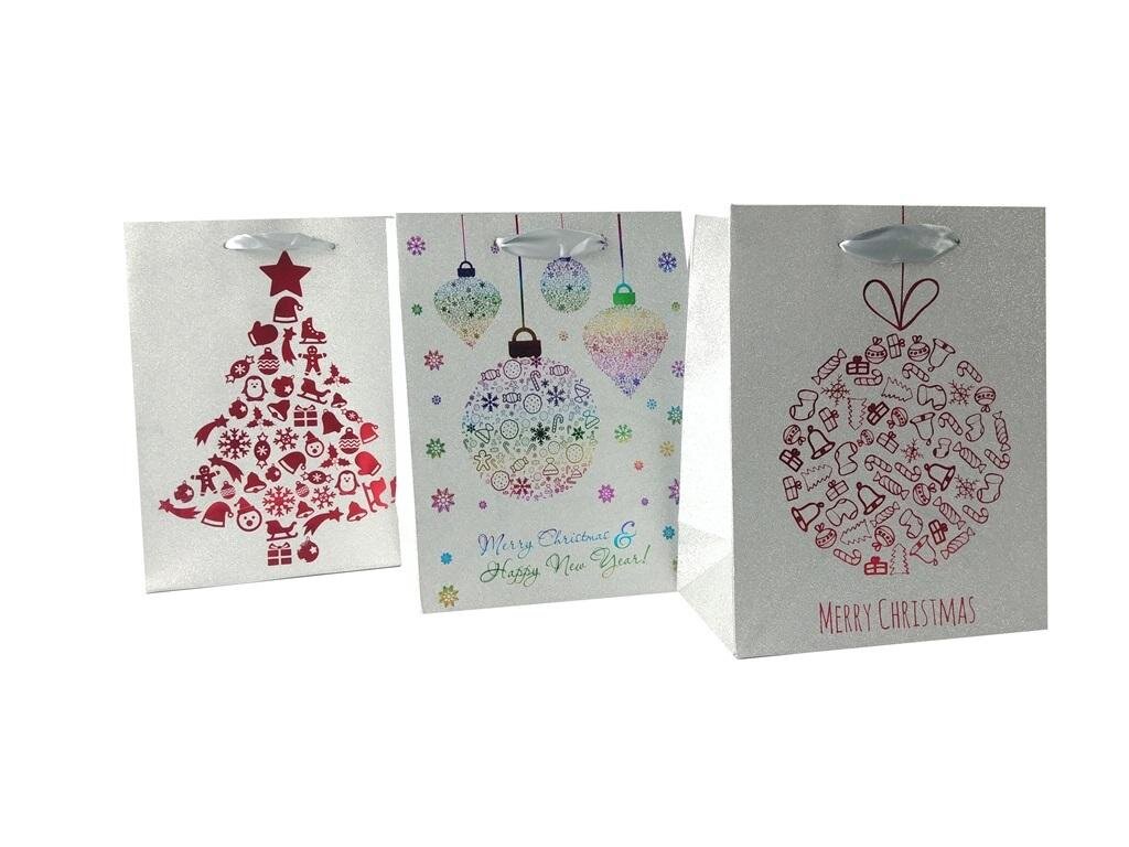 Mix wzorów, towar wysyłany losowo.Torebka świąteczna, pionowa o wymiarach 18x23x10 cm. Dostępna w 3 wzorach. Brokatowa. Kolor sznureczka idealnie komponuje się z kolorystyką torebki. Posiada wzmacniany spód. prečítať celé