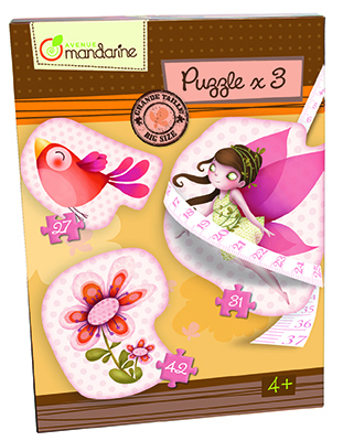 Sada kartonových puzzle 3v1 obsahuje tři velké puzzle s motivem víly, ptáčka a květiny.