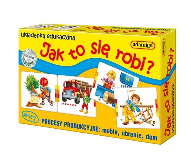 Mieszkasz w domu, w szafie trzymasz swoje ubranka, ale jak to powstało, skąd się to wzięło? Jakie czynności trzeba wykonać, aby zbudować dom? Jak powstają meble? Jak zrobiono moje ubranie? W zestawie znajduje się 15 plakietek z rysunkami 3 cykli produkcyjnych. Aby ułożyć pięć plakietek w proces produkcyjny, trzeba najpierw zadać trochę pytań dorosłym. Sprawdzisz sam, czy ułożyłeś właściwie, dzięki barwnym znakom na bokach plakietek. Powodzenia.