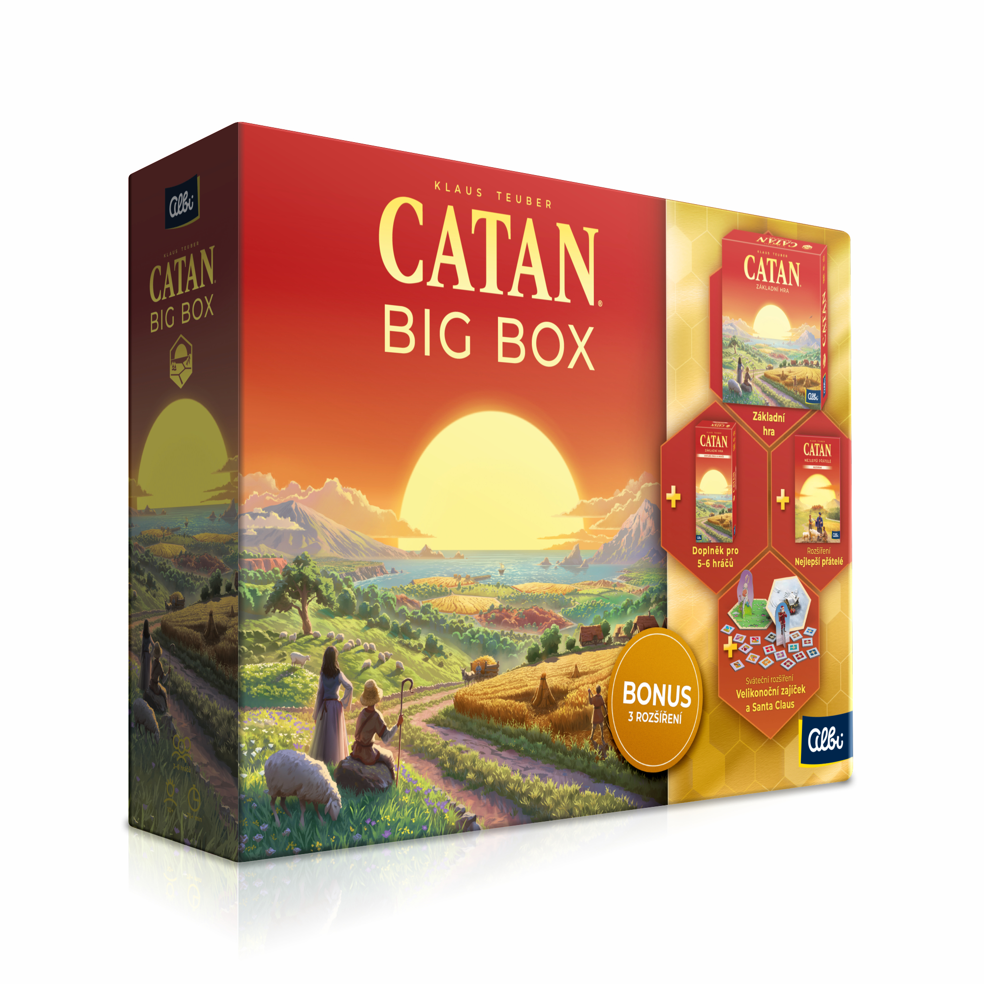 Velká sada Catan v jedné krabici – základní hra, rozšíření pro 5–6 hráčů a nové scénáře. Ideální rodinná strategie pro až 6 hráčů. Big Box obsahuje: Základní hru Catan - 6 dílů rámu, 19 dílů krajin, 16 měst, 20 vesnic, 60 silnic, 18 žetonů s čísly, 1 zloděje, 2 kostky, 4 přehledy stavebních...