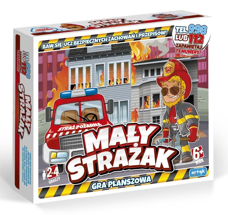Edukacyjna gra planszowa dla 2-4 graczy. Gra pokazuje na czym polega praca strażaka, dziecko nauczy się np. jak korzystać z urządzeń gaszących, jak zachować się w zadymionym pomieszczeniu, jak prawidłowo poinformować strażaków o mającym miejsce zdarzeniu. Wygrywa ten, kto jako pierwszy zdobędzie kartę zbiorczą strażaka i dojdzie do mety - zostaje mianowany komendantem straży.
