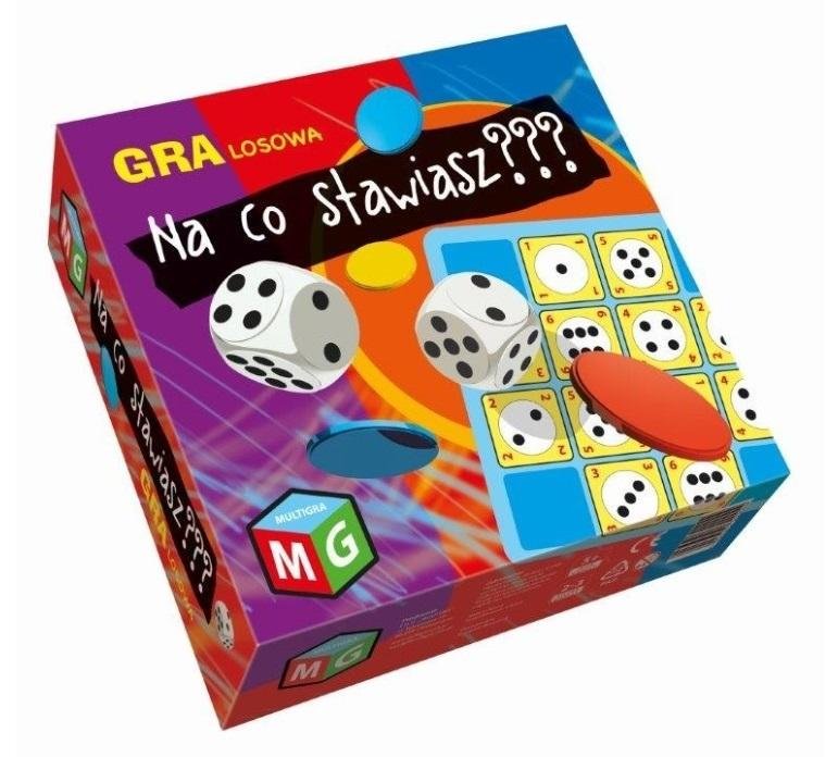 Gra " Na co stawiasz" jest prostą grą losową dla graczy w różnym wieku. Wielkie emocje i świetna zabawa podczas gry związane są z obstawieniem żetonami pól na planszy, których numery gracze starają się trafić rzucając kostkami. Gracz typujący najtrafniej numery wskazywane przez kostki zostanie zwycięzcą. Zawartość pudełka: 30 plastikowych żetonów, plansza, 2 kostki do gry, instrukcja.