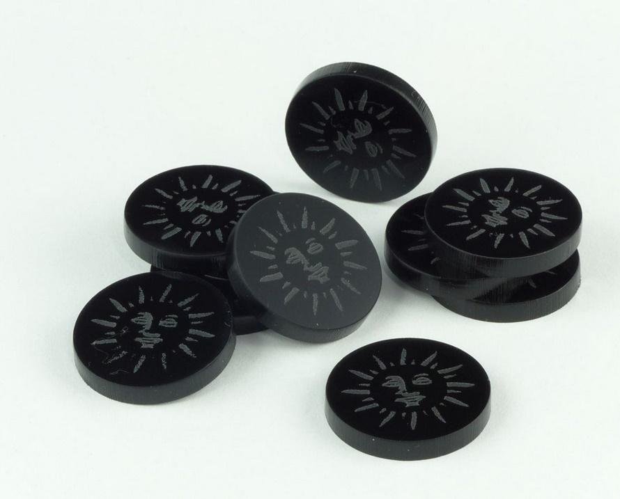 Żetony z wygrawerowaną grafiką słońca, wykonane z czarnego szkła akrylowego, o grubości 3 mm, średnica żetonu wynosi 22 mm. W opakowaniu jest 10 żetonów. Użyteczne w grach bitewnych, RPG, grach Print & Play, w prototypach gier planszowych, jako zamienniki elementów oraz przy wprowadzaniu własnych...