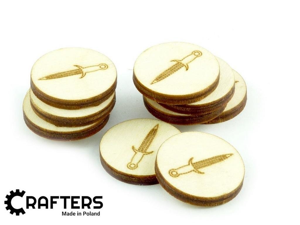 Zestaw 10 żetonów o średnicy 22 mm, wykonanych ze sklejki brzozowej o grubości 3 mm. Żetony te będą użyteczne w grach bitewnych, RPGach, grach Print & Play, w prototypach gier planszowych, jako zamienniki elementów oraz przy wprowadzaniu własnych modyfikacji zasad do gier.