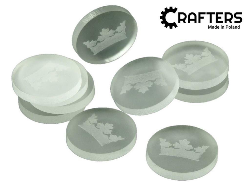 Żetony z wygrawerowaną grafiką korony, wykonane ze szkła akrylowego satynowego, o grubości 3 mm, średnica żetonu wynosi 22 mm. W opakowaniu jest 10 żetonów. Użyteczne w grach bitewnych, RPG, grach Print & Play, w prototypach gier planszowych, jako zamienniki elementów oraz przy wprowadzaniu...