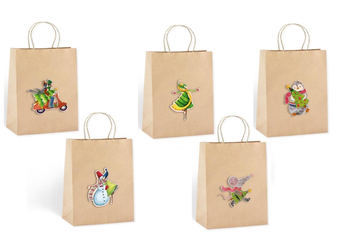 Brązowa torebka na prezent z elementem naklejanym (drewnianą aplikacją). Mix wzorów, wzór wysyłany losowo. prečítať celé