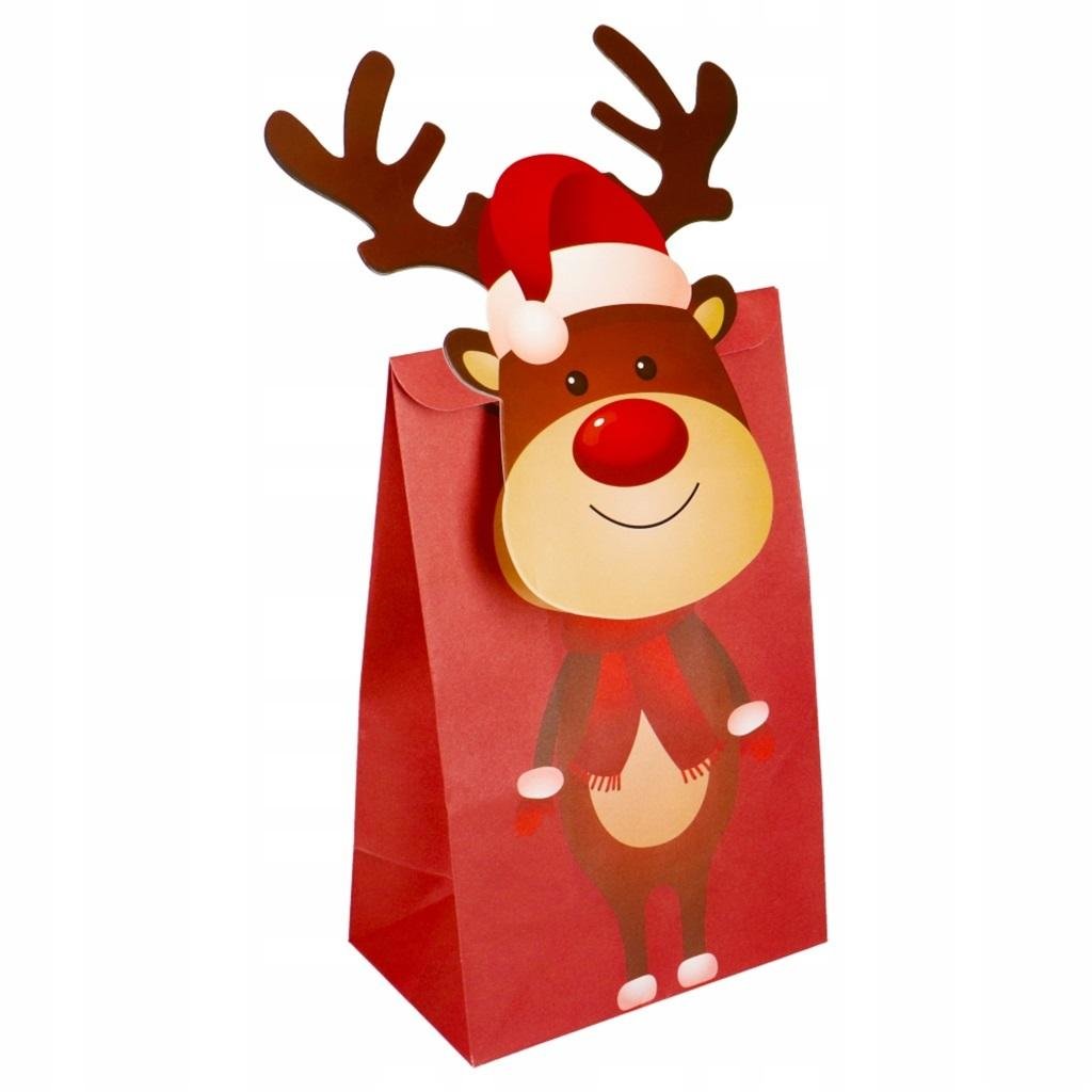 Torebki Renifer na prezent Mikołajkowy 2 sztuki:wykonane z papieru,zamykane pokrywką w kształcie głowy świątecznej postaci,pojemne idealne do różnych prezentów,świetnie sprawdzą się do prezentów mikołajkowych,idealne na słodycze i inne drobiazgi,2 sztuki w zestawie,wymiar torebki: 13 x 27 cm.