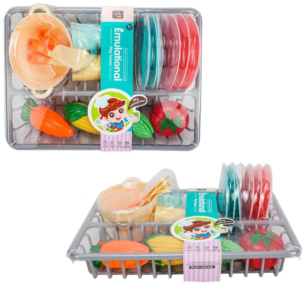 Zestaw naczyń w ociekaczu z zestawem warzyw do krojenia. Warzywa dzielone na elementy i połączone rzepem. W zestawie plastikowy nożyk do krojenia warzyw. prečítať celé