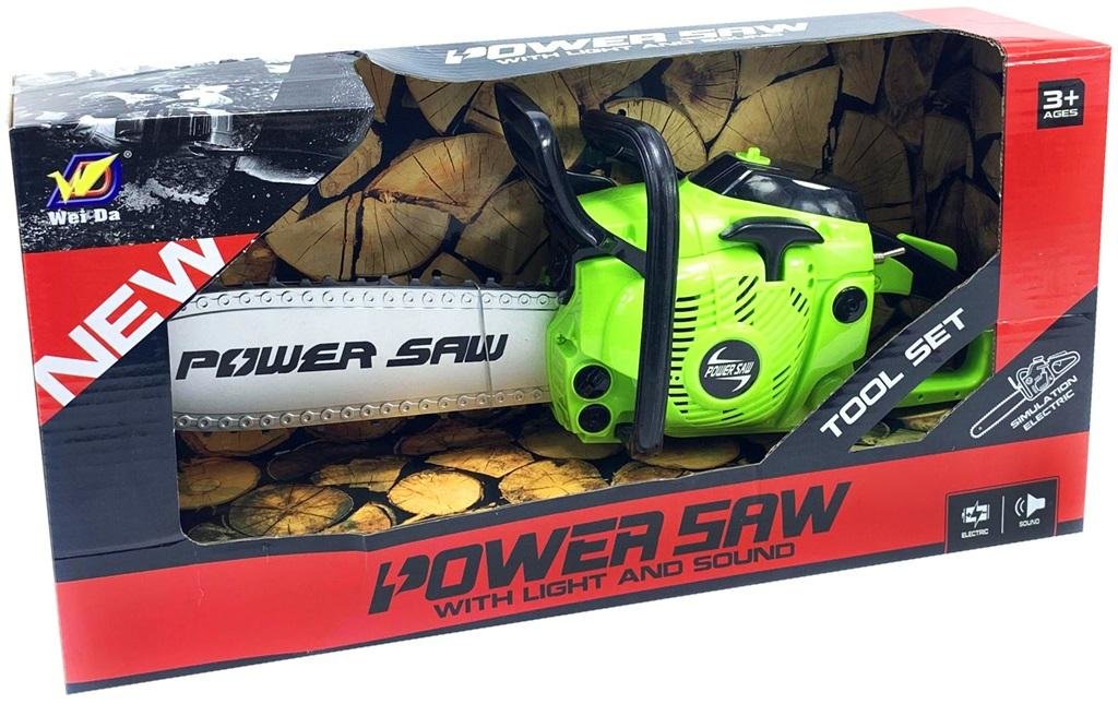 Zabawkowa piła spalinowa na baterie. Na bagnecie piły porusza się łańcuch, piła wydaje dźwięki. prečítať celé