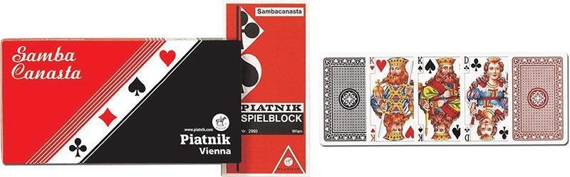 Tradycyjne, wysokiej jakości karty do gry renomowanej firmy Ferd. Piatnik & Sohne. W komplecie 3 talie w pudełku oraz notes do zapisu. Talie składają się z 55 plastikowanych kart o wymiarach 58 x 89 mm i gramaturze 310. Idealne zarówno do kanasty jak i innych gier. Wyroby wiedeńskiej fabryki...