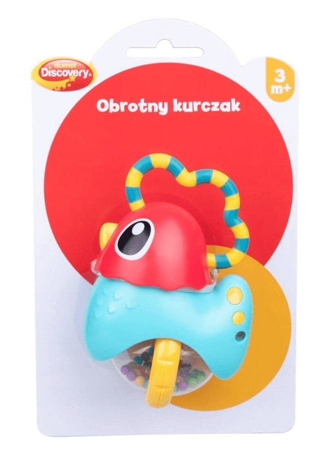 Obrotny kurczak wprawi w wyśmienity nastrój każdego fana grzechotania. Obrotowa główka zabawnie terkocze, a koraliki znajdujące się w brzuchu kurczaka wesoło grzechoczą przy potrząsaniu zabawką. Zróżnicowane faktury stymulują zmysł dotyku i wzroku malucha, rozwijając przy tym jego zdolności poznawcze.