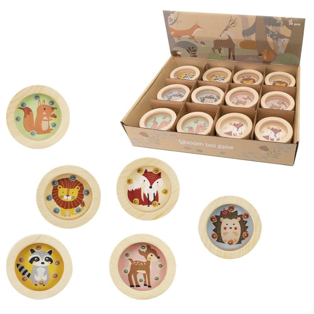 Drewniana gra zręcznościowa, rozwinie koncentrację i nauczy cierpliwości. 6 wzorów zwierzątek leśnych - wiewiórka, lisek, lew, jeż, szop, sarenka Gracze muszą balansować kulami wokół zwierzątek, aby zająć wszystkie wolne dołki. Rozwija koordynację rąk i oczu, logiczne myślenie i koncentrację. wymiary: średnica 6 cm, grubość 2 cm wiek 3+ w