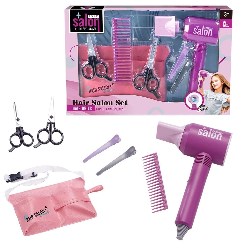 Zestaw fryzjerski składający się z wielu elementów: suszarki, torebki na drobiazgi przyczepianej w pasie, dwóch par nożyczek, grzebienia oraz dwóch spinek. Suszarka wymaga baterii: 3xAAA (niedołączone) prečítať celé