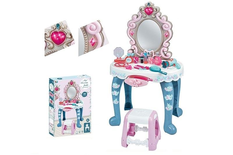 W zestawie: 6 elementów do złożenia toaletki, 5 elementów do złożenia krzesełka, 2 flakoniki perfum, 2 pomadki, 2 lakiery do paznokci, paletka z cieniami do powiek, suszarka do włosów, szczotka do włosów, grzebień, 5 spinek do włosów, 2 wałki do włosów, 2 bransoletki, zestaw naklejek, funkcje: 3 melodie, świecące ozdoby na ramie lustra, wym. Toaletki po złożeniu: 45 x 76 x 31 cm., Wym. Opk: 45 x 66,5 x 11 cm., Baterie: 2 x aa 1,5v brak w zestawie, 3+
