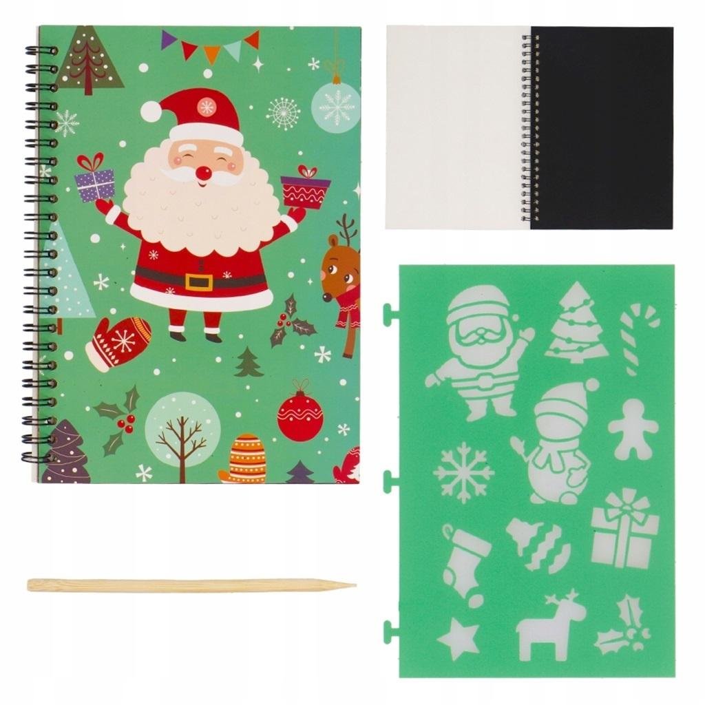 Wydrapywanka świąteczna z szablonami A5magiczny notes wydrapywankaobrazki powstają poprzez zdrapywanie czarnej warstwy powłoki, pod którą znajduje się kolorowy zadruk10 arkuszy na spiraliróżny zadruk pod czarną farbą metliczny złoty, metaliczny srebrny i w pasy czerwono zielone dzięki czemu...