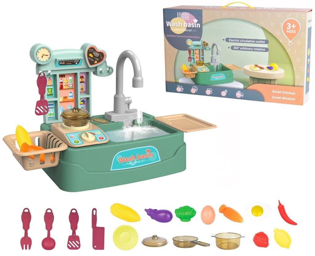 Kuchnia ze zlewozmywakiem na wodę, kuchenką, opiekaczem i zestawem akcesoriów: warzywa, owoce, przybory kuchenne, garnki. Z kranu leje się woda. prečítať celé