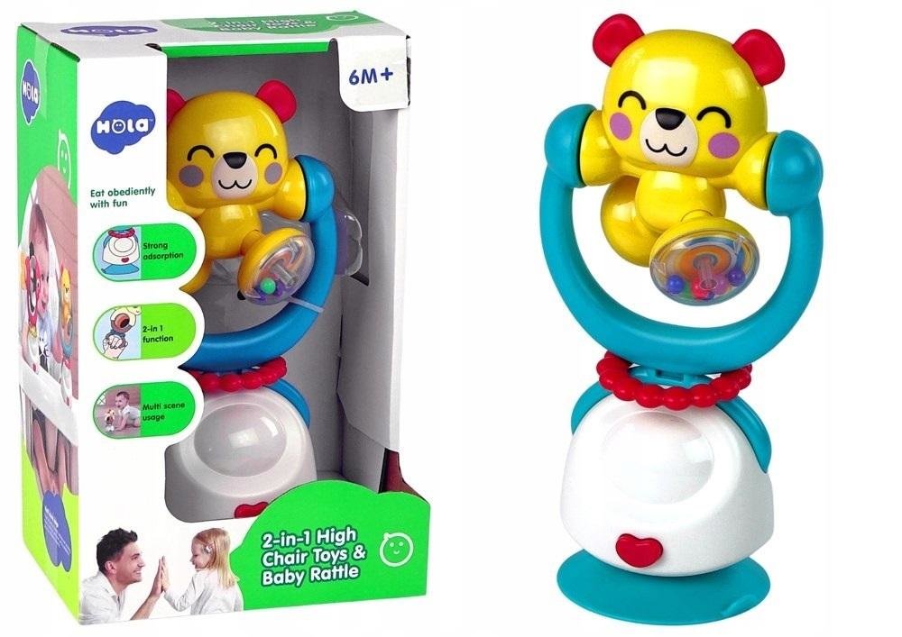 Grzechotka Miś z przyssawką dla maluchaGrzechotka posiada dużą i mocną przyssawkę, która umożliwia montaż zabawki do blatów i gładkich powierzchni. Obrotowy miś z grzechocącymi koralikami i lustereczkiem, miękkimi uszkami i uśmiechniętą buźką zachęca do zabawy. Grzechotka za pomocą czerwonego...