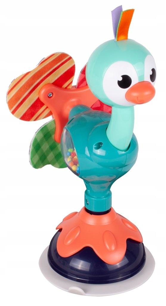 Grzechotka posiada dużą i mocną przyssawkę, która umożliwia montaż zabawki do blatów i gładkich powierzchni. Atutem zabawki jest ciekawa struktura, barwna kolorystyka grzechotki, które powodują integrację bodźców zmysłowych również poprzez ruchome elementy.