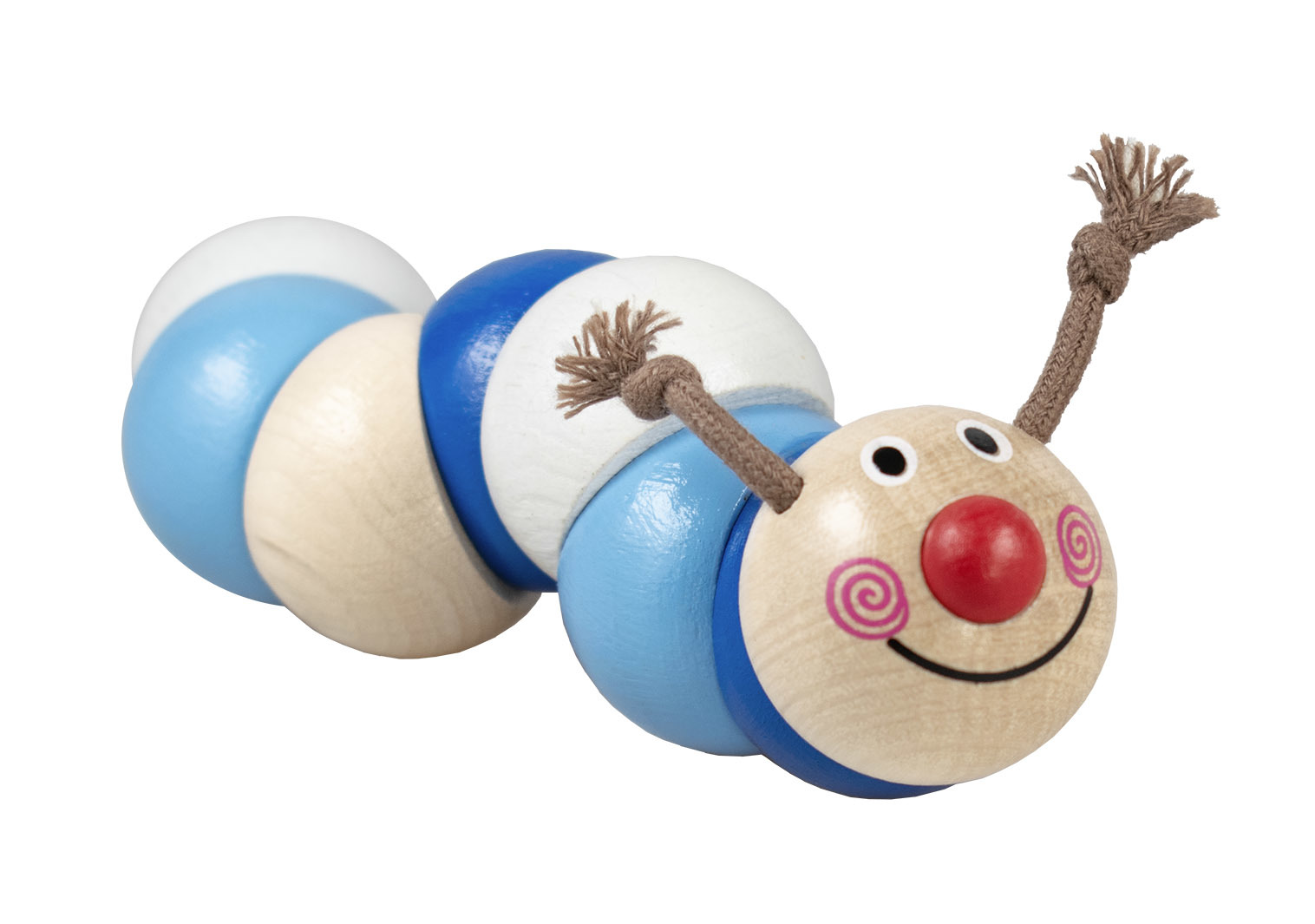 Hračka z barevných dřevěných perlí navlečených na gumě, které se pohybují, točí a ohýbají. Vhodná k procvičování jemné motoriky rukou Vašich dětí již od 6ti měsíců. Výrobek splňuje požadavky EU na bezpečnost hraček. Délka housenky je 13 cm a je připevněna na ekologické papírové kartě.