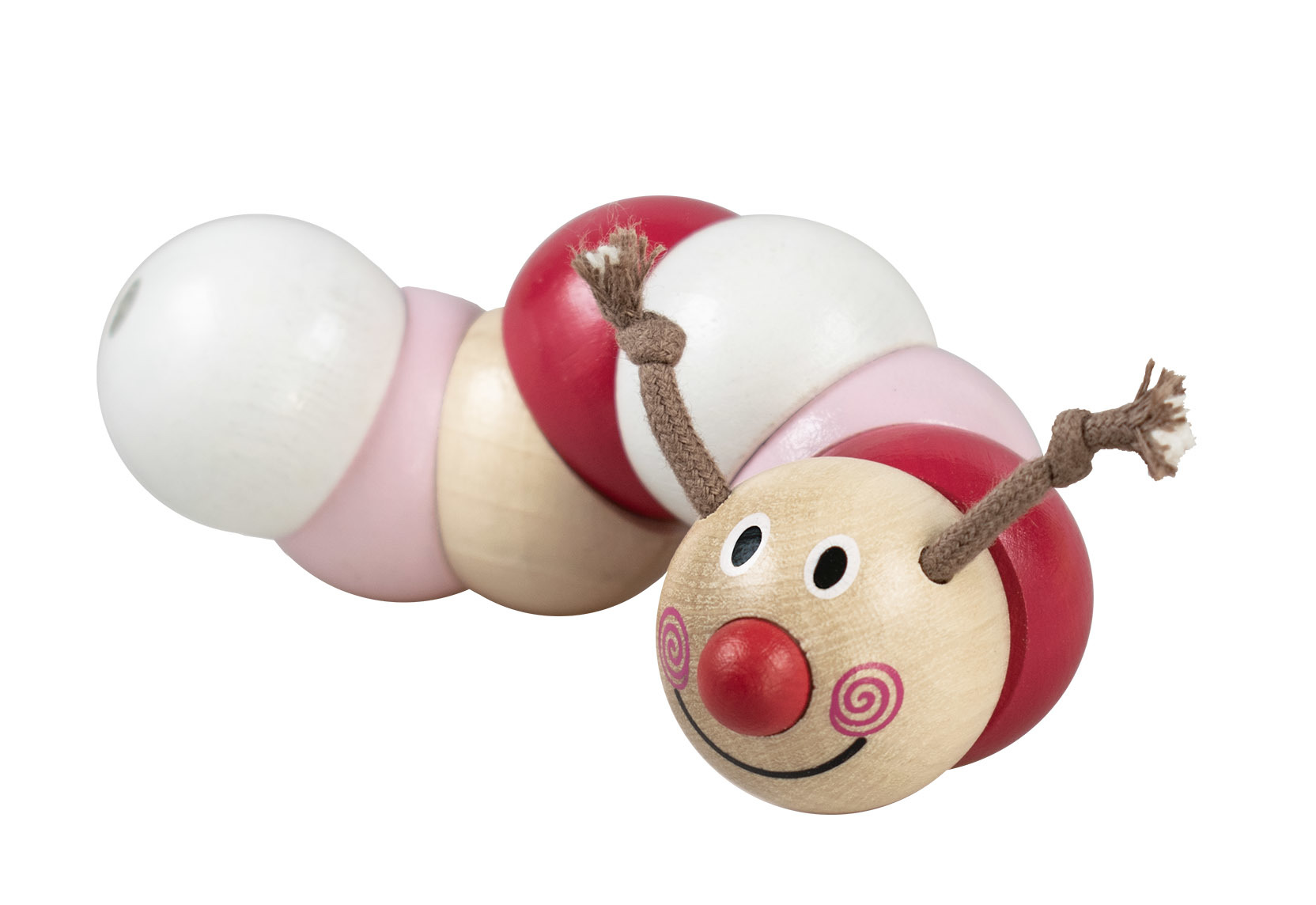 Hračka z barevných dřevěných perlí navlečených na gumě, které se pohybují, točí a ohýbají. Vhodná k procvičování jemné motoriky rukou Vašich dětí již od 6ti měsíců. Výrobek splňuje požadavky EU na bezpečnost hraček. Délka housenky je 13 cm a je připevněna na ekologické papírové kartě.