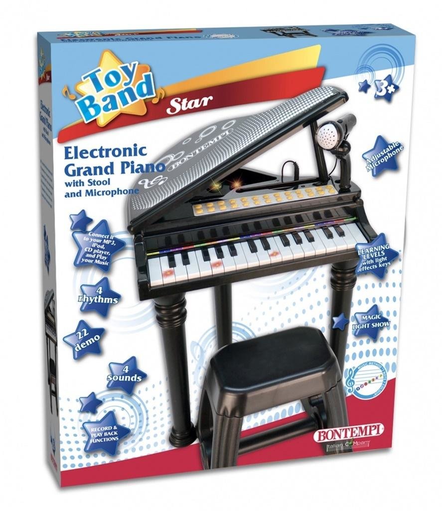 Fortepian elektroniczny włoskiej firmy Bontempi, to wymarzona zabawka młodego pianisty. Instrument zawiera: 31 klawiszy z funkcją podświetlania do nauki gry, 22 melodie, 4 rodzaje dźwięków, 4 rytmy, gniazdo MP3 (przewód w zestawie), mikrofon oraz stołek. Wymiary produktu 35 x 31 x 53cm. Zasilanie 4xR6/AA 1,5V (nie dołączono do zestawu).