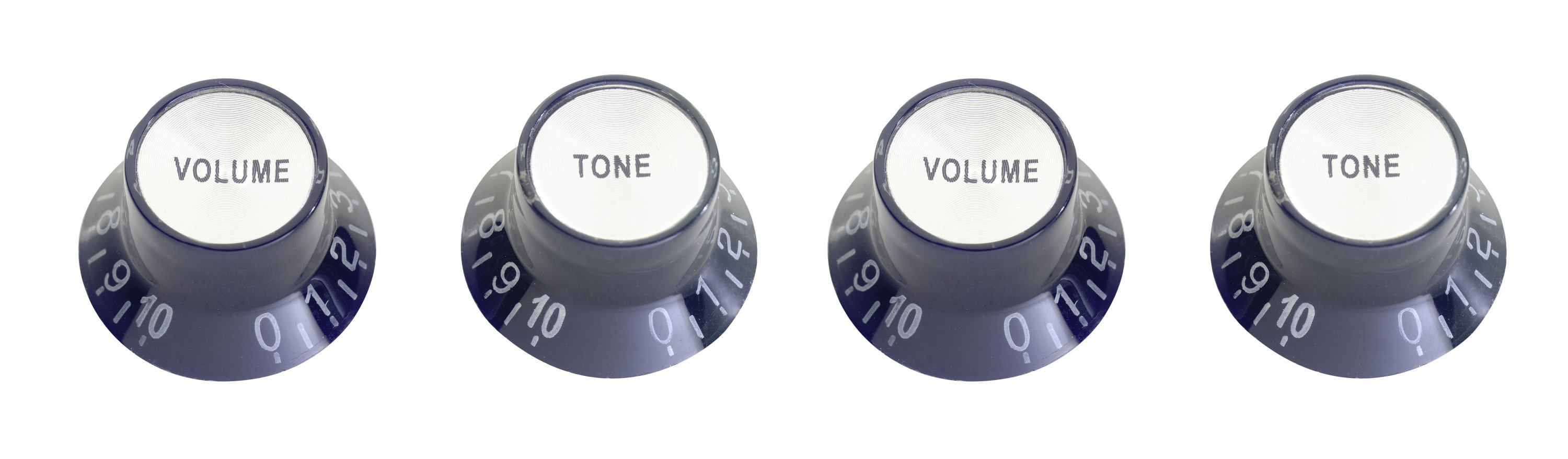 Sada knoflíků na potenciometry pro elektrickou kytaru typu LP, 2x Tone, 2x Volume, barva černá, bílý popis. prečítať celé