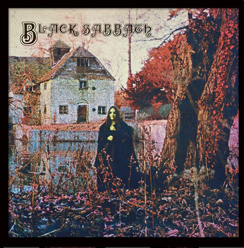 Velký plakát v rámu s grafikou kapely Black Sabbath.