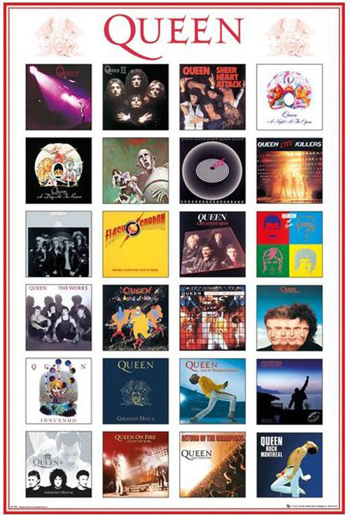 Oficiální plakát z katalogu produktů s logem, grafikou a fotografiemi slavné rockové skupiny Queen.