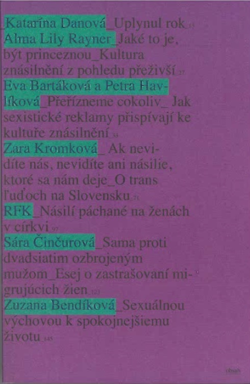 Monografia Bez súhlasu.txt je súborom 7 textov 10 autoriek, ktoré v prostredí Slovenska a Česka pojednávajú o kultúre znásilnenia. Hovoria o postojoch, predstavách a predsudkoch, ktoré máme o sexuálnom násilí a ktoré prispievajú k tomu, že sa sexuálne násilie a obťažovanie v našich komunitách...