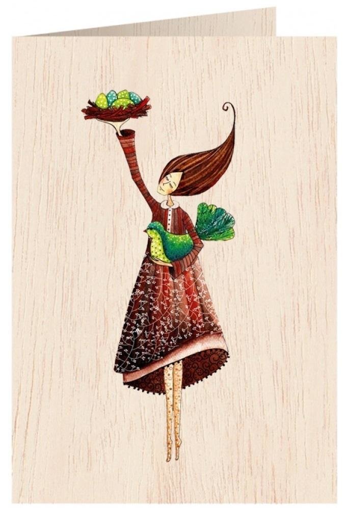 Karnet drewniany C6 + koperta Kobieta z ptaszkiem