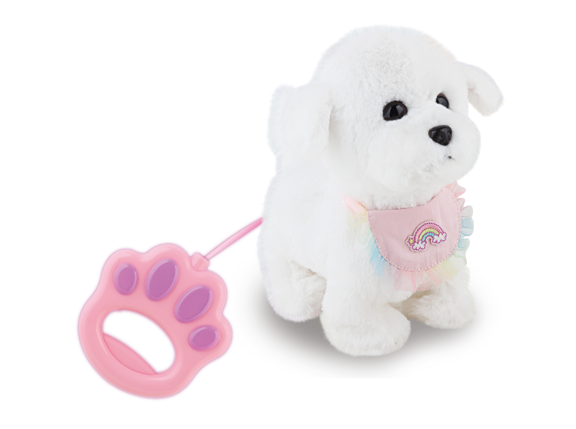 Pes chodící s efekty na kabel. Velikost 22 cm. Kabel s ovladačem se připojuje do otvoru na krku. Chůze, štěkání, vrtění ocasem, pohyb hlavy. Stiskem vodítka (ovladače) - chůze. Dotykem hlavy - efekty. Zatleskání - chůze. 3xAA baterie nejsou součástí. Přepínač ON/OFF na bateriové krabičce na spodní straně psa pod suchým zipem.