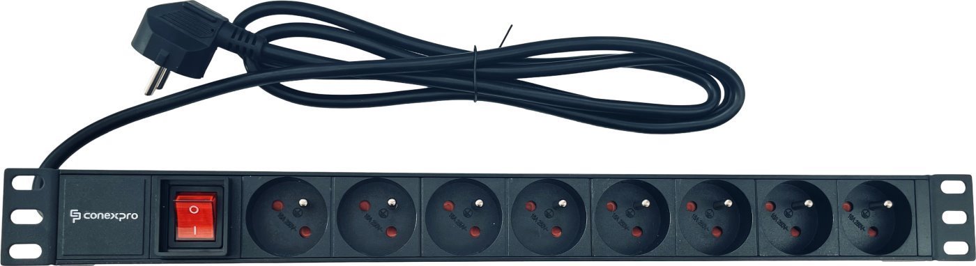 Rozvodný panel Conexpro ponúka osem zásuviek 230 V typu FR umiestnených v robustnom hliníkovom tele, ktoré zaisťuje efektívne odvádzanie tepla a dlhú životnosť zariadenia. Vďaka prívodnému káblu dlhému 1,4 metra sa ľahko začlení do vášho 19" dátového rozvádzača s výškou 1U. Panel zvláda maximálne zaťaženie až 16 A, čo je dostatočné pre bezpečný prevádzok bežných sieťových prístrojov, ako sú servery, switche a routre.