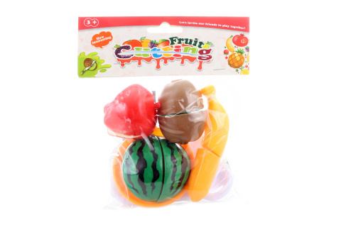 Plastová sada krájení ovoce. Balení obsahuje 4 druhy ovoce, talířek, prkénko a nožík. Ovoce je rozpůlené a poloviny k sobě spojené suchým zipem. Baleno v sáčku. Rozměry balení cca 17x22x5 cm. Velikost ovoce - jablko 6 cm, kiwi 6 cm, banán 12 cm, meloun 8 cm. Věk 3+ prečítať celé