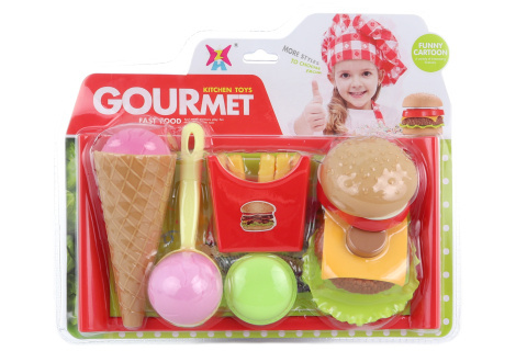 Sada plastových potravin obsahuje zmrzlinu v kornoutku, kopeček zmrzliny, naběračku, makronku, hranolky, hamburger který jde rozdělit na jednotlivé ingredience (houska, karbanátek, salát, sýr, rajče, majonéza) a tác. Rozměr balení cca 29,5 x 25 x 7 cm. Věk 3+ prečítať celé