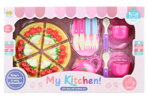 Plastový čajový set s dortem. Balení obsahuje dort o velikosti cca 20 cm, 2 hrnečky, 4 talířky, konvičku a příbory. Rozměry balení cca 45,5 x 28 x 7,5 cm. Věk 3+ prečítať celé