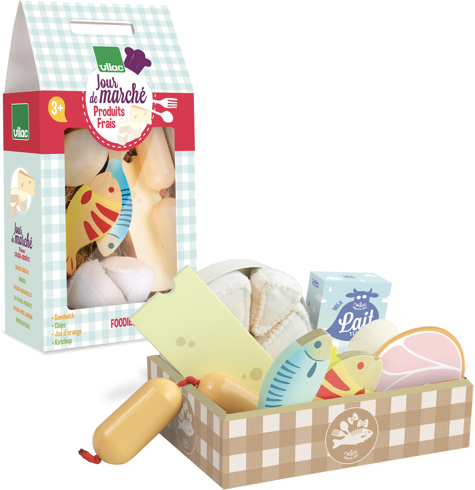 Pěkný lepenkový box obsahuje 2 ryby, plátek šunky, vejce, krabici mléka, sýr a špekáčky. Tento set je idálním doplňkem do kuchyněk Vašich dětí, 11 dílná sada. Hračky Vilac mají značku francouzské agentury ADEME, to znamená, že tyto dřevěné hračky jsou vyráběny ekologicky. Šetří životní prostředí,...