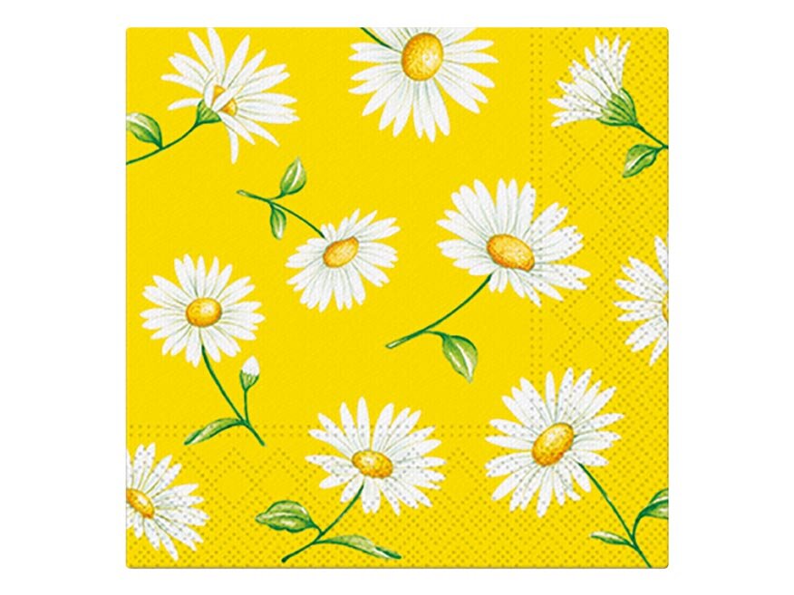 Třívrstvý papírový ubrousek. Krásné kvalitní ubrousky s motivem kopretin na žlutém podkladu vykouzlí příjemnou atmosféru. Ideální na zahradní prostírání, oslavy nebo na zkrášlení interiéru.