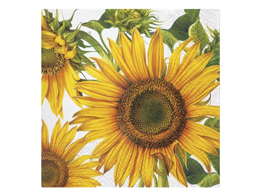 Třívrstvý papírový ubrousek. Krásné kvalitní ubrousky s motivem slunečnic na bílém podkladu vykouzlí příjemnou atmosféru. Ideální na zahradní prostírání, oslavy nebo na zkrášlení interiéru.