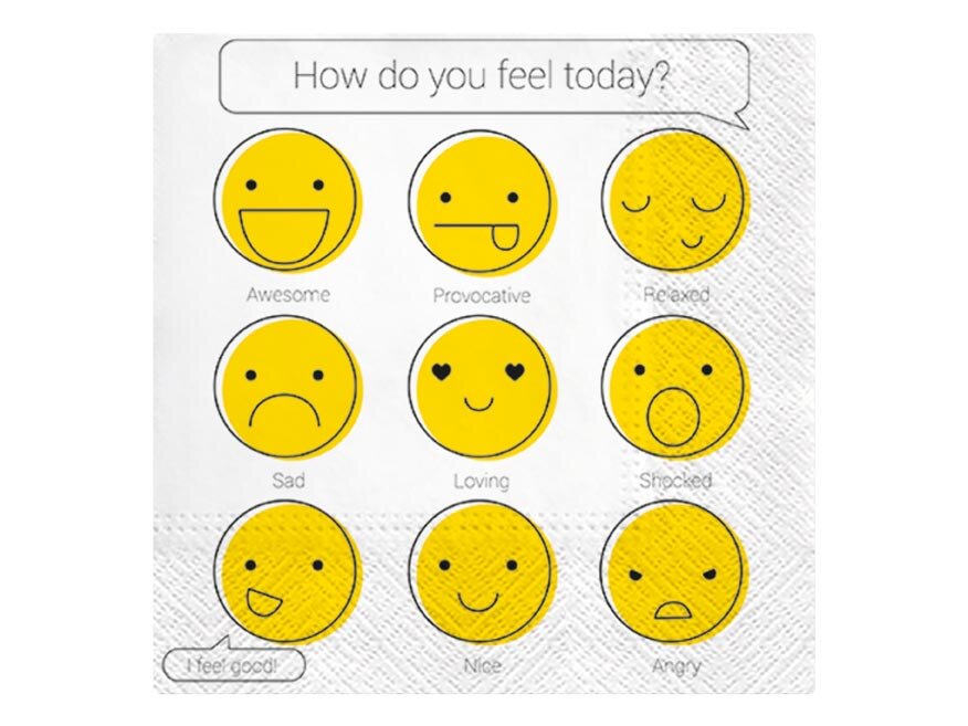 Třívrstvý papírový ubrousek. Krásné kvalitní ubrousky s motivem smajlíků na bílém podkladu a nápisem „How do you feel today“ vykouzlí příjemnou atmosféru. Ideální na zahradní prostírání, oslavy nebo na zkrášlení interiéru.