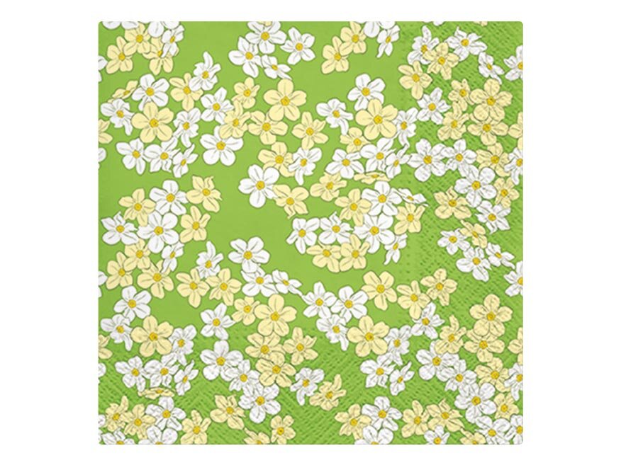 Třívrstvý papírový ubrousek. Krásné kvalitní ubrousky s motivem drobných kvítků na zeleném podkladu vykouzlí příjemnou atmosféru. Ideální na zahradní prostírání, oslavy nebo na zkrášlení interiéru.