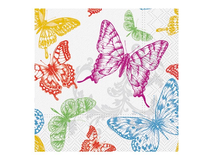 Veselý motiv pestrobarevných motýlů na ubrousku vnese na váš stůl radost a lehkost. Skvěle se hodí nejen na jarní nebo letní posezení, ale díky svému univerzálnímu designu i pro celoroční využití.