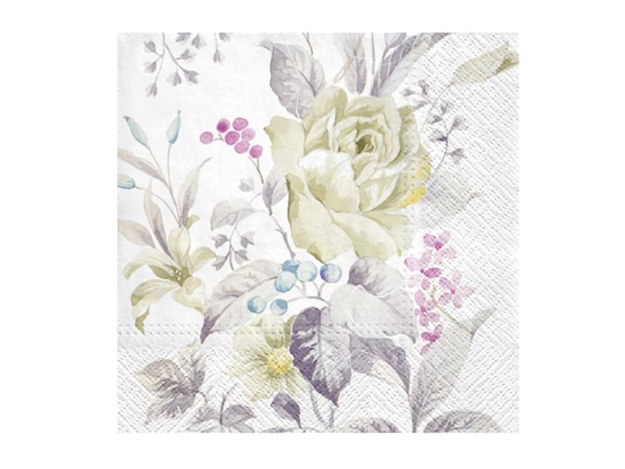 Celoroční ubrousek akvarelové květy Váš stůl může být uměleckým dílem. Tento ubrousek s akvarelovými květy o rozměru 33 × 33 cm vnese do stolování jemnost a lehkost malovaného obrazu. Zelená růže, šedofialové listy a pastelové bobule vytvářejí harmonii tónů, která působí elegantně a...
