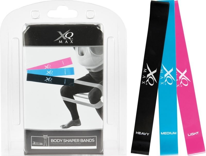 XQMAX BODY SHAPER BANDS SET OF 3 BANDS. COLOR PINK 225C 300X50X0,6MM, COLOR BLUE 2995C 300X50X0,8MM, COLOR BLACK 300X50X1MM. EACH WITH WHITE LOGO PRINT. LIGHT/MEDIUM/HEAVY RESISTANCE. MATERIAL: LATEX. INCLUDING BLACK DRAWSTRING POUCH WITH WHITE XQMAX LOGO PRINT. SET PACKED IN CLAMSHELL WITH...
