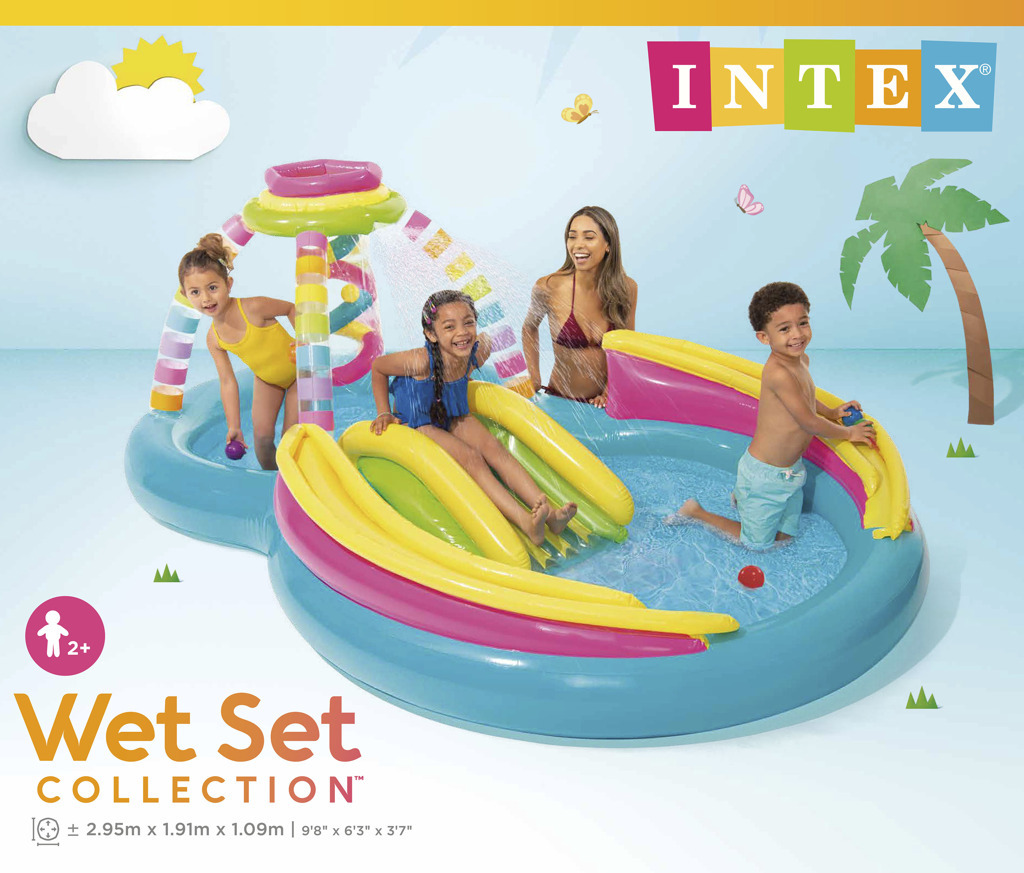 Skvělé hrací centrum v duhovém designu, se kterým si v horkých letních dnech užiješ spoustu zábavy a osvěžení. Hrací centrum se skluzavkou, sprškou a 6ti míčky v balení. Extra polstrování, vypouštěcí ventil v podlaze. Vyrobeno z testovaného masivního vinylu. Přibližná velikost 295×191×109 cm....