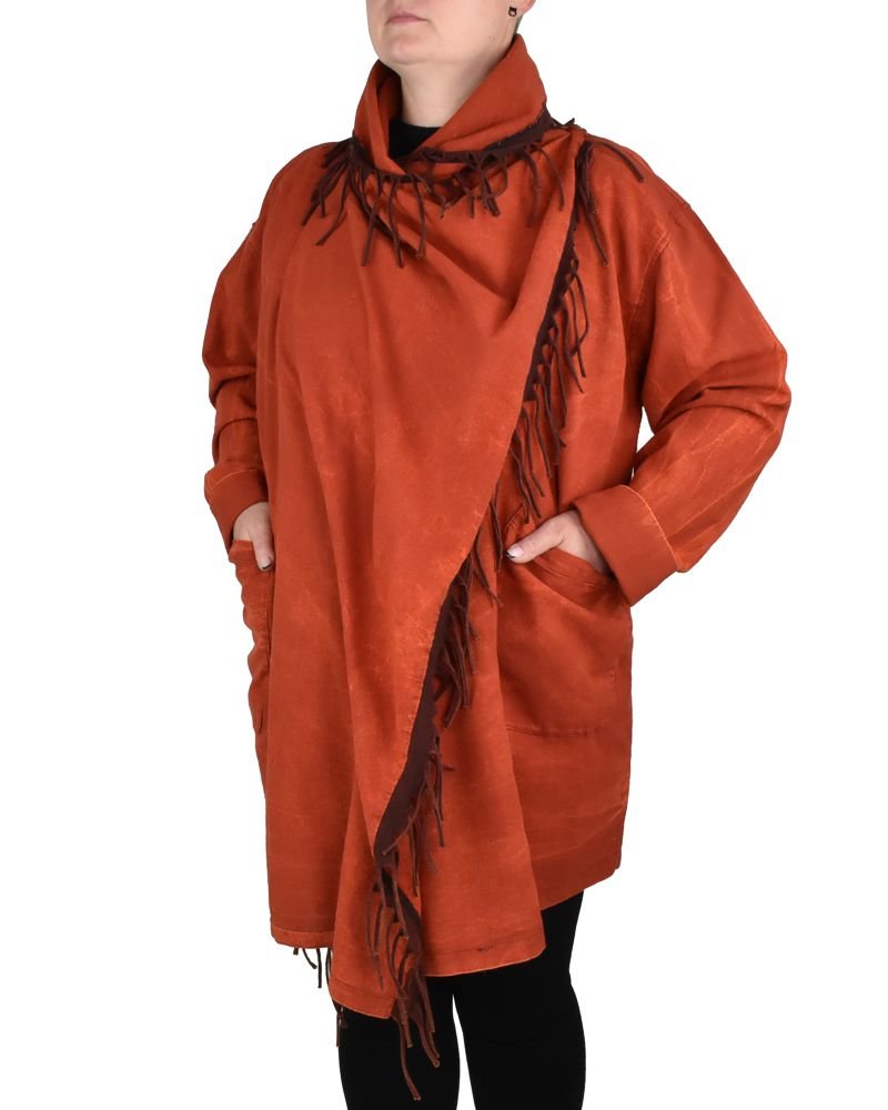 Kardigan s vysokým límcem a třásněmi. Popis: přední část delší než zadní, vysoký límec, zapínání u krku na dva konflíky, hluboká kapsa na každé straně, třásně po obvodu a dlouhý rukáv. Rozměry: ramena: 59 cm délka rukávu: 60 cm délka: 85 cm Materiál: 100% bavlna Textil, který nosíte, položte...