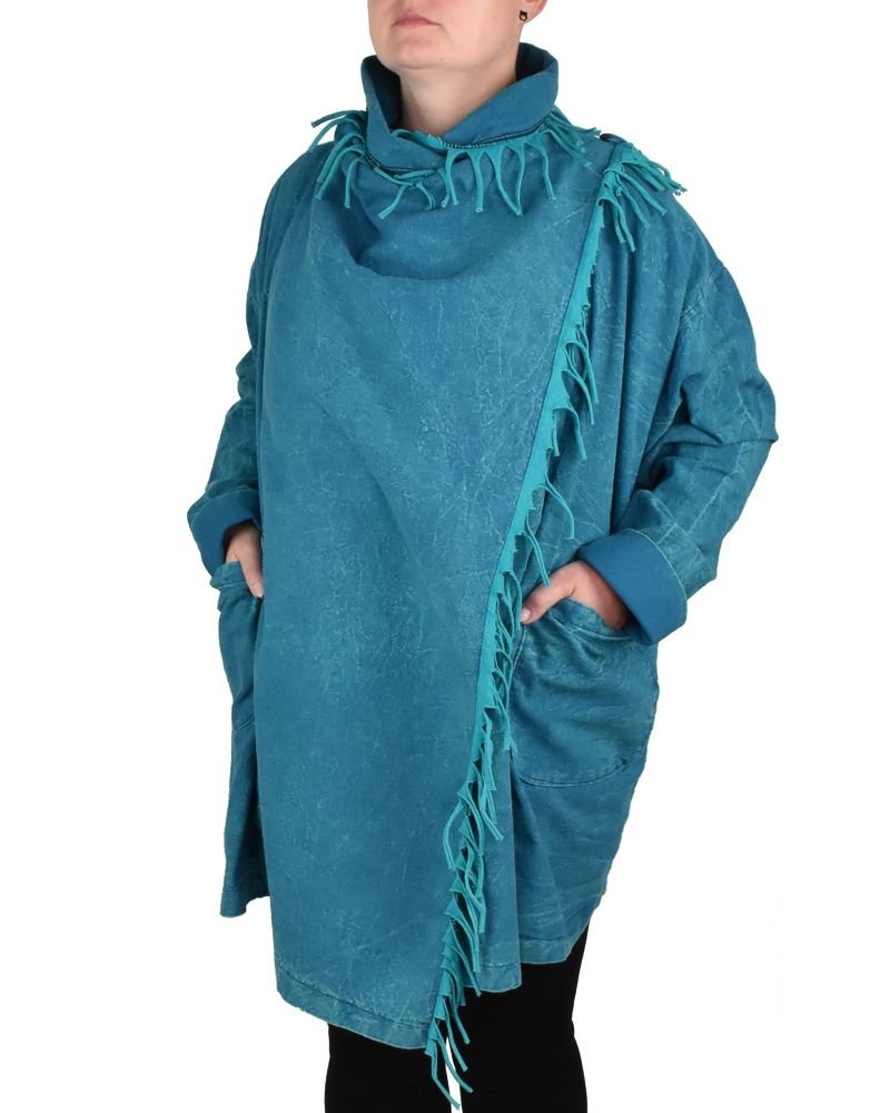 Kardigan s vysokým límcem a třásněmi. Popis: přední část delší než zadní, vysoký límec, zapínání u krku na dva konflíky, hluboká kapsa na každé straně, třásně po obvodu a dlouhý rukáv. Rozměry: ramena: 63 cm délka rukávu: 61 cm délka: 83 cm Materiál: 100% bavlna Textil, který nosíte, položte...