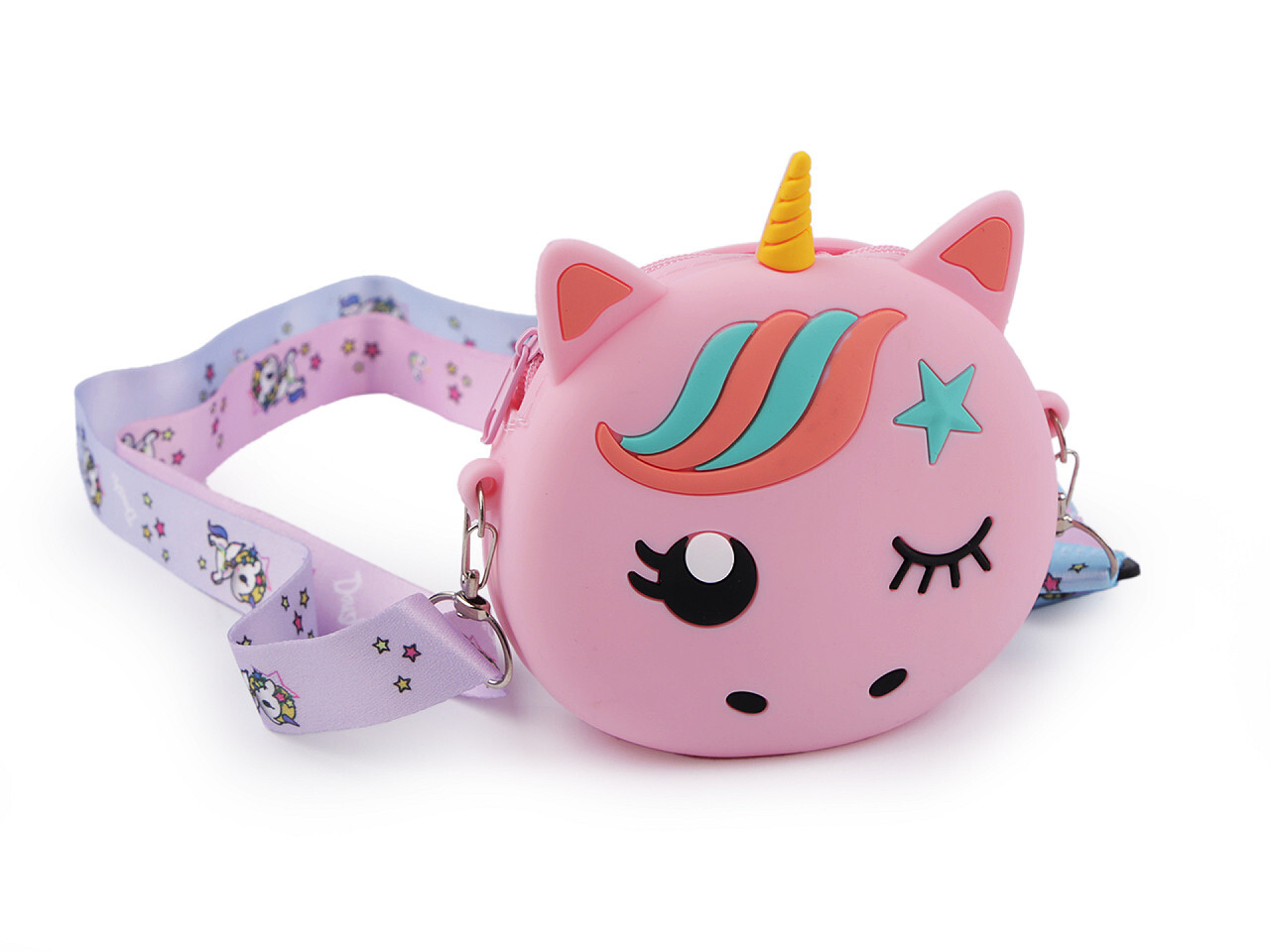 Dětskou silikonovou kabelku jednorožce si zamilují nejmenší slečny. Schovají do ní své poklady a nezbytnosti na procházky. Když z kabelky sundají popruh, mohou ji používat jako pouzdro nebo klíčenku. Kabelka se uzavírá se na zip. Její součástí je nastavitelný popruh s potiskem jednorožců na karabiny.
