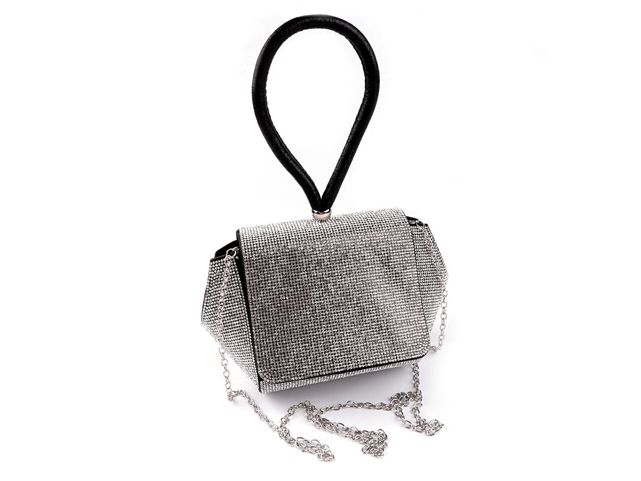 Elegantní společenská kabelka je celá posetá drobnými broušenými kamínky, díky kterým se noblesně třpytí. Uzavírá se na klopu s magnetickým zapínáním, má poutko do ruky. Navzdory své malé velikosti je uvnitř prostorná. Kabelka je vyztužená, uvnitř má polyesterovou podšívku a malou kapsičku na drobnosti. Ke kabelce patří odepínatelný řetízek. Můžete ji nosit s řetízkem přes rameno nebo bez něj, za poutko nebo jen tak v ruce.