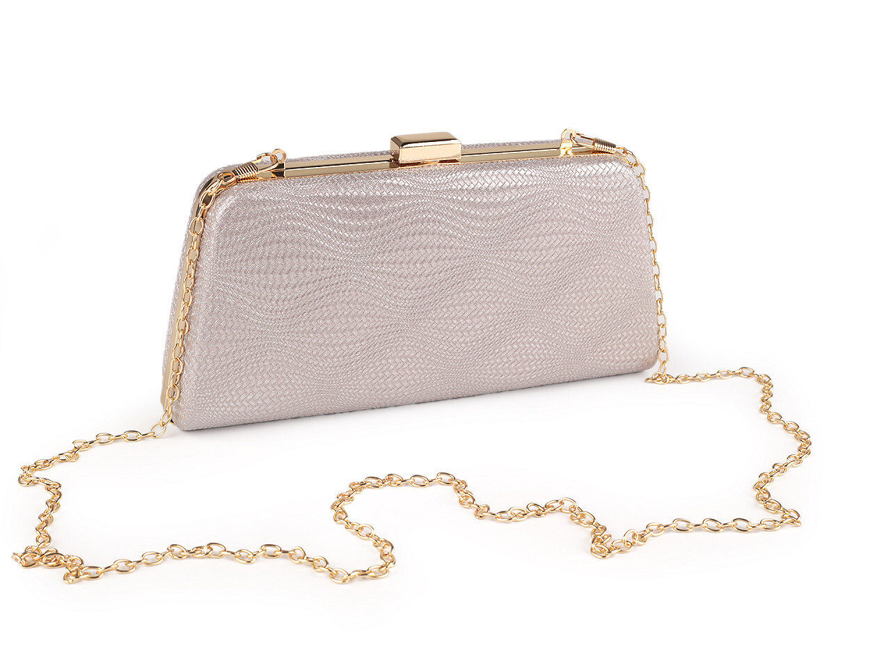 Malá společenská kabelka vyzařuje eleganci a luxus, má zajímavou lesklou povrchovou strukturu, efektně se třpytí. Zdobí ji výrazné lesklé zapínání a rámeček po celém obvodu. Kabelka je pevně vyztužená, její součástí je dlouhý odnímatelný řetízek na karabiny. Můžete ji nosit v ruce nebo jako crossbody přes rameno či do kříže.
